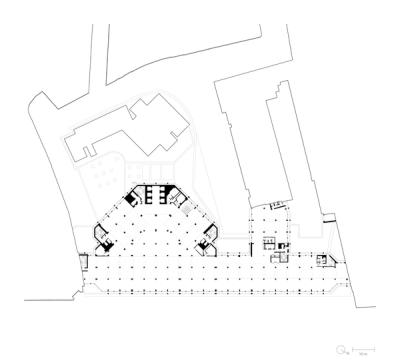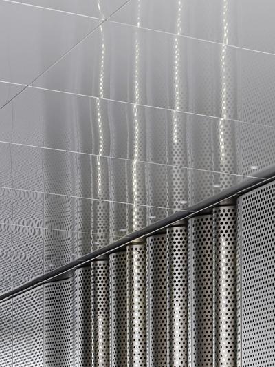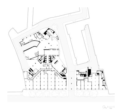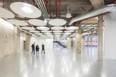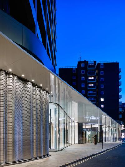 As found workspaces We treated EMI's old ground-floor recording studios as ‘as found’ pieces, exposing their concrete structure as we converted them – and the nearby loading bay – into unique workspaces for new media tenants. They are wrapped in a 5-metre-high ribbon of glass and perforated stainless steel that curves around the building under a blade-like canopy. This contains the views of passers-by, focusing their attention on the lower floors, and also brings new life to a previously dark frontage and underpass from Tottenham Court Road.
