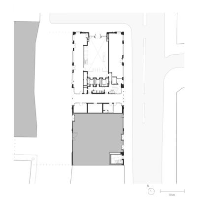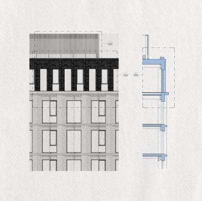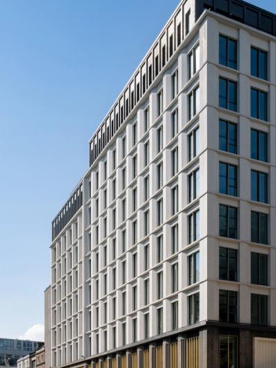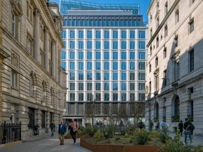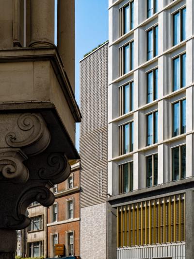 A Moorgate building With the extensive construction work associated with the Elizabeth Line, this was always going to be a new-build, but we wanted it to have the same solidity and gravitas as the Grade II-listed buildings immediately around it. The façade is made up of precast concrete panels, prefabricated with a palette of coloured aggregate drawn from these historic neighbours. The cladding to the technical shaft – which requires louvres for ventilation – reads as a separate volume.
