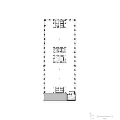 A mix of uses The mezzanine-level spaces are sandwiched between a double-height reception and 8 office floors, built with a lightweight steel superstructure to minimise loads. The composite concrete floor slabs are acoustically isolated from the ground-borne vibrations generated by the railway below. We added an extra level to the consented scheme, increasing the floor area to 70,000sqft. With the buildings to the west ramping up in height to overlook 101 Moorgate, we introduced landscaped terraces and planted screening to green the roofscape.