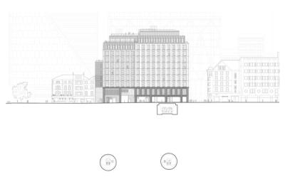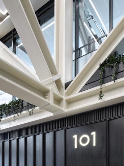 Technical constraints While the Elizabeth Line has transformed underground travel in London, it has also brought dramatic change above the surface: each of its stations has become a focus for new development, often negotiating very challenging technical and contextual constraints. With a station ventilation shaft integrated within the envelope of the building, 101 Moorgate is no exception.