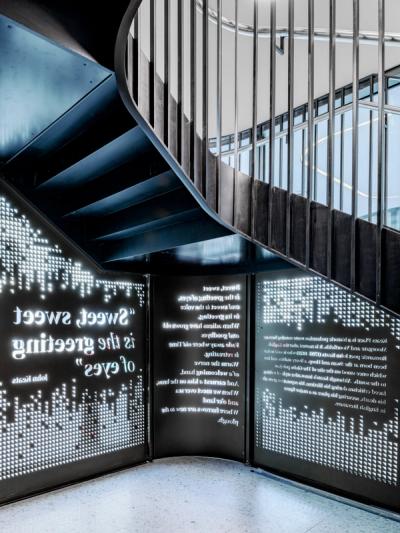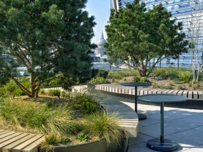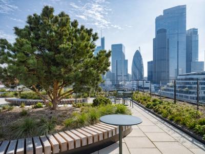Flexibility and specificity The flexible office floors are a blank canvas for tenants, with a central core and WCs placed at each end with the plant rooms. There are many amenities throughout the building, including the outside terraces, business lounge and bike centre. More specific to the location is Keats Place, a historic right of way crossing the site named for the poet John Keats, who is said to have been born nearby. The right of way has been preserved and an artwork installed which reproduces the words of his poem “Sweet, sweet is the greeting of eyes”.