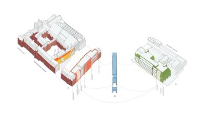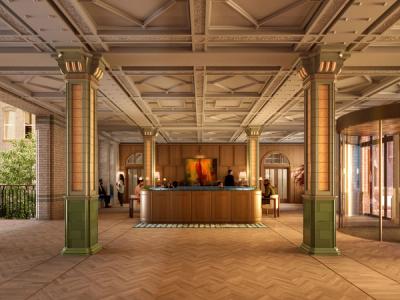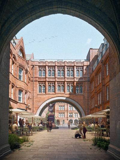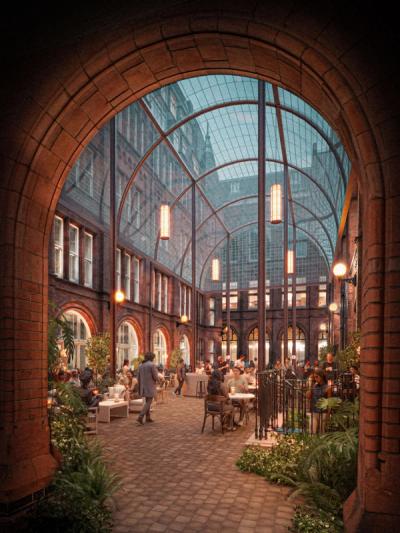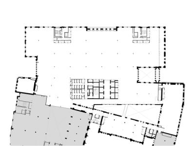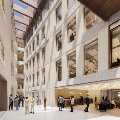 Reconfigured interior The 1990s extension effectively crashed into the Waterhouse structure, with a circular atrium introduced between the two. By rearticulating the northern edge of the historic fabric, we have been able to reinstate the original layout too, with a covered, wedge-shaped courtyard that connects with the reception area. With the lift cores arranged orthogonally, and the existing northern stair cores retained, we have been able to declutter the floorplates above. These floorplates gradually cut back as you rise through the building to create external terraces at the upper levels, and a pavilion and roof terraces have been added to the sixth floor.