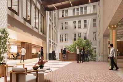 Defensive presence The original Waterhouse building was developed in phases around external courtyards and internal atria. Updated and remodelled several times over the years, the most dramatic reconfiguration came in 1995 when a large new-build element – by architects EPR – was added behind it, building over the western part of Greville Street. While this structure (known as 2 Waterhouse Square) has generous floor-to-floor heights and great structural bones, it now feels outdated and has a defensive presence on the surrounding streets.