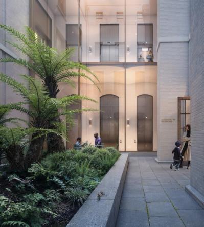 East wing Behind the façade, there is little of historical significance in the east wing, so we propose to reconfigure this with a double-stacked corridor of hotel rooms around a central courtyard, reflecting the building’s original proportions. A new lift core will run up the centre with lightweight bridge links to the hotel rooms. With some rooms looking out onto this lightwell space, we have lined them with a glazed curtain wall which has fritted areas for privacy, and wrapped the core with solid, reflective glazed ceramic tiles.