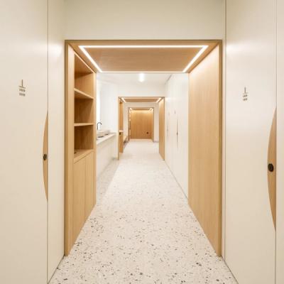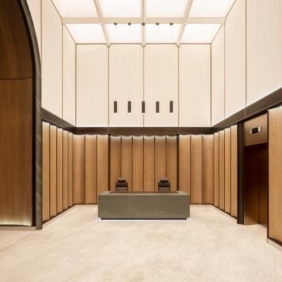 Heritage of craft During the Victorian era, the site was occupied by Arrowsmith & Co, makers of cabinetry and upper-class interiors under Royal warrant. Inspired by this heritage, the detailing of the building is meticulously crafted. We created a fluted detail, scalloped in plan, for the grand vaulted entrance to the office spaces on Dering Street, and repeated this motif at a different scale in timber around the reception desk – and at many other locations across the building.