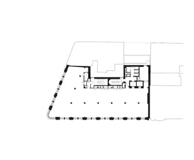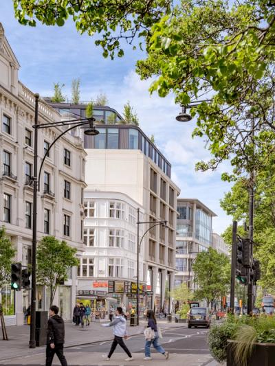 External expression The Burlian’s external appearance is shaped by its surroundings and the site’s history. With two additional floors, the mass of the building is now paired to that of the one opposite, and together the two form a gateway into New Bond Street. By moving the office entrance onto Dering Street – where it takes advantage of a pedestrian route through to the new Elizabeth Line station – we were able to give the corner onto Oxford Street the full shopfront treatment: glazed, curved glass, a projecting canopy and a cut-back floorplate inside to elevate the customer experience.