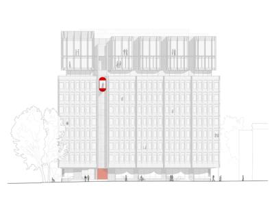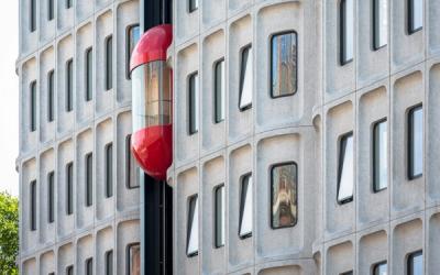 Red is the colour To signal the arrival of The Standard on Euston Road, we designed a pill-shaped shuttle lift that runs up the north elevation to the top-floor bars and restaurant, following a natural break in the massing of the building. Technically complex in its engineering, the lift is exactly the same red colour as London’s famous Routemaster buses (and The Standard branding).